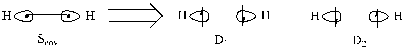 H2 分子的 2 个电子在两个 H 原子之间 共享 。由此,电子在两个 H 原子的定域原子轨道中有多种可能的占据形式。电子可能分别占据两个原子轨道,或者同时占据某个原子轨道。这些不同的占据形式构成了不同的 价键结构 。