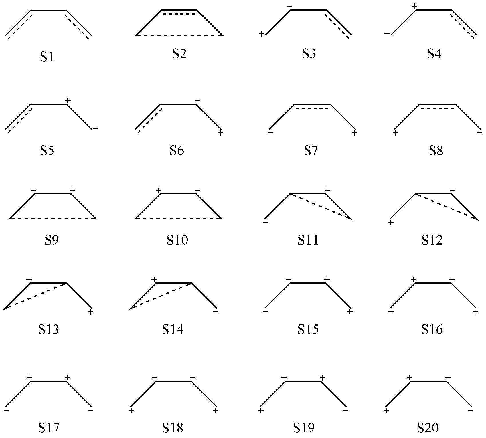 For ionic structures, suppose we now have one doubly occupied orbital and one empty orbital (i.e., one ionic pair). In this case, the positions of the ionic pair must first be fixed. Since an ionic pair is not a covalent bond, it is not subject to the “non-crossing” rule, and thus all configurations can be listed directly by simple combinatorics. In the end, we can obtain the 20 valence bond structures shown in Fig. 2.2.5, including 2 covalent structures (S1–S2), 12 first-order ionic structures (containing one ionic pair, S3–S14), and 6 second-order ionic structures (containing two ionic pairs, S15–S20).