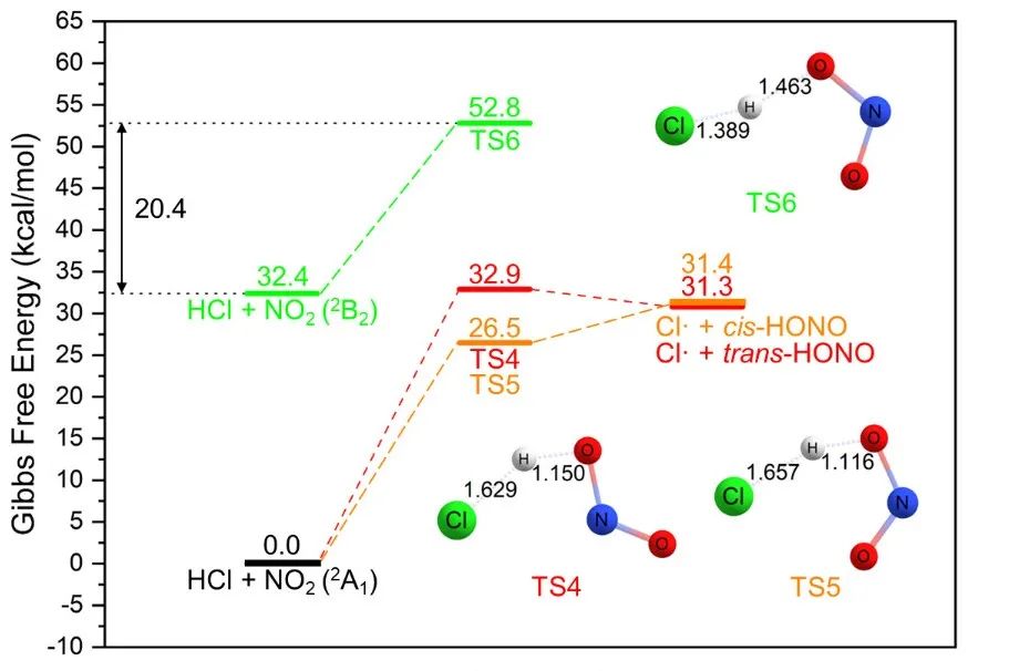 甲烷的活化及其高效转化是一个重要的科学问题。在最近与厦大化院汪骋课题组合作研究中,我们介绍了一种利用二氧化氮作为光媒介和分子氧作为终端氧化剂将甲烷转化为甲醇的方法(已发表于Inorg. Chem.)。该过程可以实现17%的甲烷转化率,同时对CH3ONO2的选择性高达78%。HCl催化光硝化途径的理论与实验结果吻合。 Activation of methane and its conversion to added-value products is an important topic which requires chemical solutions with high yields and selectivity. In our recent collaborative study, we present the oxidation of methane to methanol using nitrogen dioxide as a photo-mediator and molecular oxygen as the terminal oxidant. This process achieves the methane conversion of 17% while the selectivity towards CH3ONO2 is as high as 78%. Joined experimental and theoretical investigation support the HCl-catalyzed photo-nitration pathway. 提出这个方法的动机是为了解决选择性转化高惰性甲烷的挑战。甲烷在大气中通过涉及NO2的复杂光反应自然发生活化,但NO2在大规模甲烷转化中的潜力尚未实现完全探索。 The motivation behind the presented proposal is to address the challenges in selectively converting methane which is highly inert. Methane activation occurs naturally in the atmosphere through complex photoreactions involving NO2, but the potential of NO2 in large-scale methane conversion is not fully explored. 我们计划建立一个化学循环实现光驱动NO2介导的CH4转化,将其转化为CH3OH,其中CH3ONO2作为气体中间体。该策略可以避免过氧化,而且可以通过硝酸甲酯的水解获得甲醇这个重要的平台化学品。 The plan is to construct a chemical looping for the photo-driven NO2-mediated CH4 conversion to CH3OH via CH3ONO2 as a gas intermediate. This strategy can prevent over-oxidation and obtain methanol as an important platform chemical through the hydrolysis of methyl nitrate. 激发态NO2具有活化烷烃的能力,这已被它在低温(-10°C)下与乙烷的光硝化反应所证实。然而,NO2和甲烷之间的反应直到180°C才开始发生,在这个温度下甲烷主要被转化为COx(该现象与理论计算结论一致)。我们发现了CH4与基态2A1态下NO2反应的三条不同途径(见下图)。所有这些途径的吉布斯自由能垒都在37-44 kcal/mol的范围内,比低温(-10°C)反应的能垒高的多。我们没有找到任何CH4与激发态2B2态下NO2反应的反应路径。 Excited NO2 has demonstrated the ability to activate alkanes, as evidenced by the successful photo-nitration of ethane at a low temperature of -10°C. However, the reaction between NO2 and CH4 does not take place until 180°C, at which temperature the methane is converted to COx as the main products. Theoretical investigations also support this experimental phenomenon. We found three different pathways for the reaction of CH4 with NO2 in the ground, 2A1 state (see figure below). Nevertheless, all of them have the Gibbs free energy barriers of 37-44 kcal/mol, which are too high for a reaction to take place at a low temperature of -10°C. We could not locate any reaction paths for CH4 and NO2 in the excited, 2B2 state. 幸运的是,我们发现HCl可以通过氢原子转移(HAT)反应催化甲烷的光硝化。理论研究表明,HCl可以以两种不同的方式与NO2(2A1)反应,其自由能垒(26-33 kcal/mol)比CH4与NO2(2A1)反应自由能垒低,但仍然没有低到可在-10°C下轻易进行。在NO2分子被450 nm LED照射激发后,HCl可以与NO2(2B2)发生反应,其自由能垒仅为20.4 kcal/mol(见下图)。因此,在可见光的帮助下, HCl与NO2发生氢提取反应产生Cl•自由基。在线质谱(MS)证实了Cl•自由基的存在,此外,光激发Al(NO3)/AlCl3混合物后大量的HONO被检测到。 Fortunately, we found that HCl can catalyze methane photo-nitration via relay hydrogen atom-transfer (HAT) reactions. Theoretical investigations show that HCl can react with NO2 (2A1) in two different ways with lower free energy barriers (26–33 kcal/mol) than CH4 but the energy barriers are still not low enough to make these reactions happen easily at -10°C. After NO2 molecules are excited by the 450 nm LED illumination, HCl can react with NO2 (2B2) species with the low 20.4 kcal/mol free energy barrier (see figure below). Thus, the free Cl• radical can be readily generated from the HCl molecule via the H-abstraction by NO2 with the assistance of visible light. The existence of Cl• radical is supported by the online MS and a substantial amount of HONO is also detected after photoexciting a mixture of Al(NO3)/AlCl3. 随后,Cl•自由基与CH4反应,重新生成HCl并产生CH3•自由基。CH4与Cl•自由基之间的氢原子转移反应(HAT)的能垒(约为1.67 kcal/mol)要比CH4与NO2之间反应的能垒(37–44 kcal/mol)低得多。接着,通过CH3•自由基与O2、NO2、NO之间的反应,可以在相对较低的温度下选择性生成CH3ONO2(可以水解生成CH3OH)。 The Cl• radical can then react with CH4 to regenerate HCl and produce CH3• radical. The HAT between CH4 and Cl• radical has a much lower barrier (about 1.67 kcal/mol) than that between CH4 and NO2 (37–44 kcal/mol). Then, CH3ONO2 can be selectively produced at a relatively low temperature via the reaction between CH3• radical and O2, NO2, NO. The produced CH3ONO2 can be hydrolyzed in water to produce CH3OH. 上述展示的催化循环的简明表示概括了提出的机制。该循环始于可见光激发加热硝酸铝Al(NO3)3产生的NO2;随后,激发态NO2与CH4和O2发生反应,产生硝酸甲酯(CH3ONO2);硝酸甲酯继而水解生成甲醇(CH3OH)。这个过程所生成的硝酸(HNO3)和硝酸根离子(NO3−),高效地循环回到Al(NO3)3。在甲烷的光硝化过程中,HCl作为催化剂起到促进氢原子转移(HAT)反应的作用。 这项工作为烷烃升级领域打开了新的