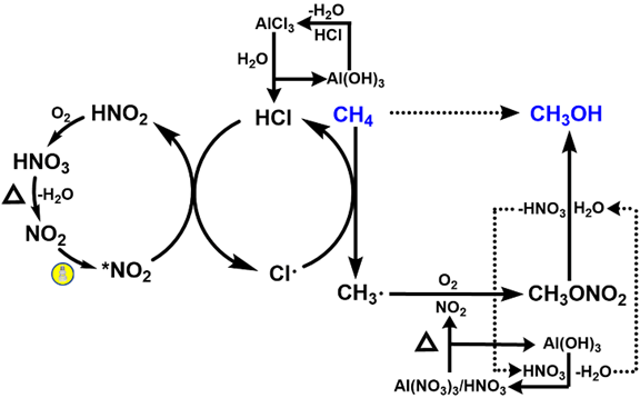 The concise representation of the catalytic loop shown at the top summarizes the proposed mechanism. It starts with visible light exciting NO2 which is generated by heating aluminum nitrate Al(NO3)3. The excited NO2 then reacts with CH4 and O2, resulting in the production of methyl nitrate (CH3ONO2). This methyl nitrate is subsequently hydrolyzed to produce CH3OH. During the process, nitric acid (HNO3) and nitrate (NO3−) are generated and efficiently recycled back to Al(NO3)3. In the photo-nitration process of methane, HCl acts as a catalyst facilitating relay hydrogen atom transfer (HAT) reactions.