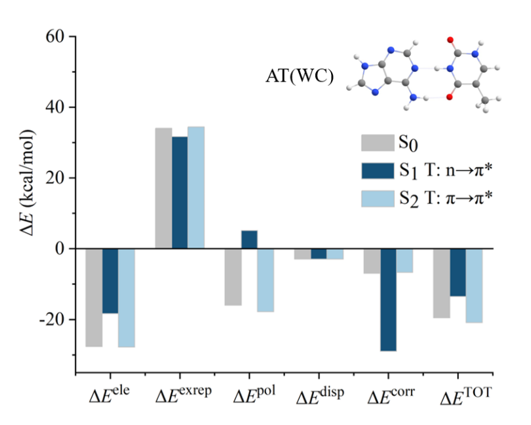 该方法将含时密度泛函理论(TDDFT)和广义Kohn-Sham理论能量分解分析(GKS-EDA)方法相结合,基于TDDFT的计算结果,将EDA中的各个能量分项表示为所有单激发行列式对该能量分项贡献的线性组合。GKS-EDA(TD)方法将单激发分子间相互作用体系的相互作用能被分解为静电项、交换-排斥项、极化项、相关项和色散项。该方法可以用于探讨各种激发态模式(局域激发,电荷转移激发,混合激发模式)分子间相互作用的本质,也可以通过对垂直激发能的进一步分解理解单体轨道相互作用与激发能分项之间的关系。除了PCCP论文里面的例子外,该方法已经应用于各种常见中等体系分子间相互作用的本质研究,揭示不同几何构型不同激发态的变化规律。如下图所示,基态(S0)和第一(S1),第二激发态(S2)中Waston-Crick构型的AT碱基对相互作用的本质截然不同:激发态S1中,静电相互作用不再占主导,电子相关反而起着最重要的作用。