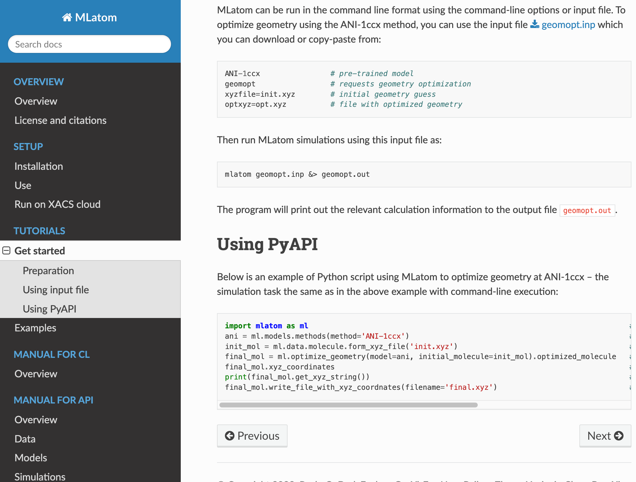 The new manual comes with the Get started tutorial showing side-by-side how to use MLatom in command line and in Python. It provides an idea how to use MLatom’s Python API for typical simulations.