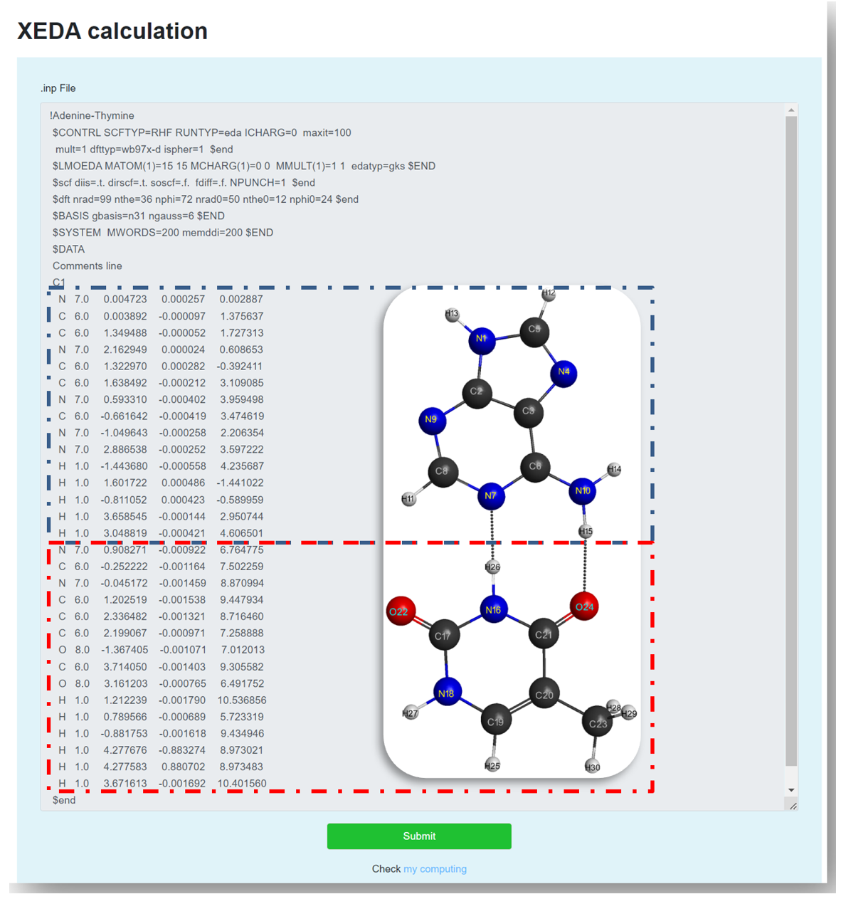 Take the GKS-EDA calculation of adenine and thymine base pair as an example, which is available on the XACS website (http://xacs.xmu.edu.cn/records?example_id=108&editable=0&attribution_program=XEDA). Here is the input file.