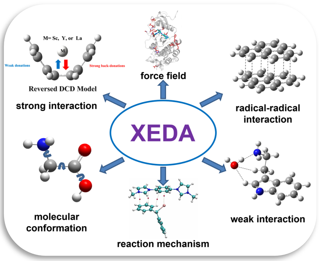Xiamen energy decomposition analysis program, XEDA, has been developed by Prof. Peifeng Su and his students for more than 10 years. XEDA is the only EDA program, which can analyze various intermolecular interactions, ranging from weak interactions (van der Waals, hydrogen bonds) to strong covalent bonds (triple bonds), from gas phase to condensed phase, from closed-shell to open-shell molecules, from ground to excited states.