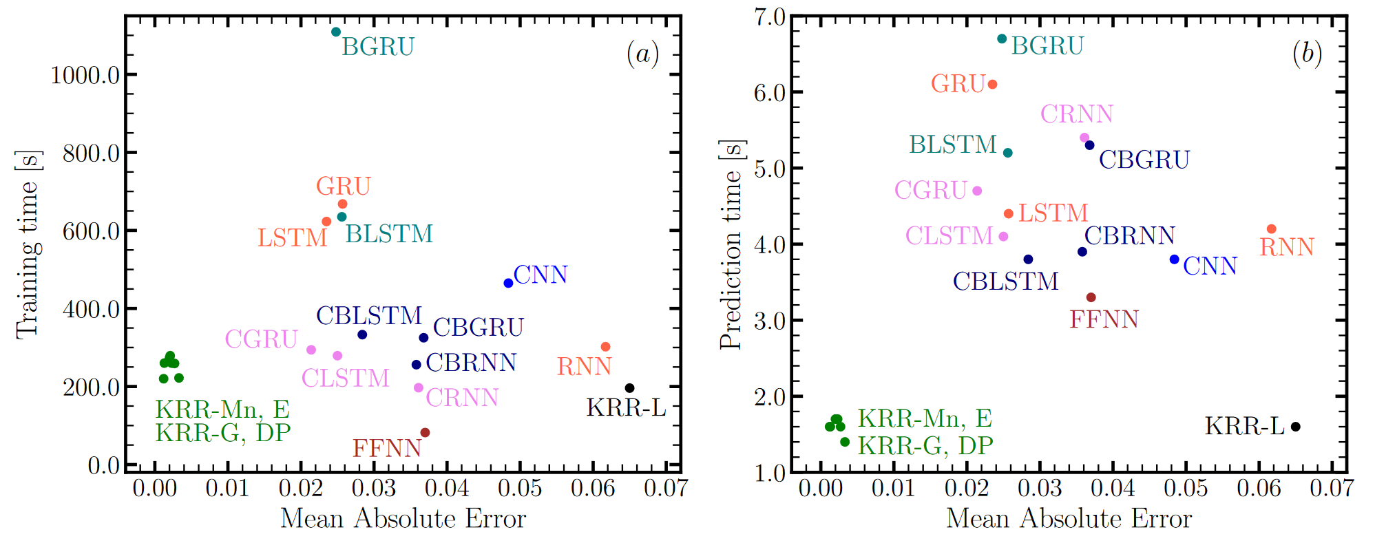 The comparative study is performed for a general two-state spin-boson model where the performance of the models was assessed by the mean absolute error (MAE) and computational times for training and prediction. In NN models, each model has been tuned to have approximately the same number of trainable parameters. In kernel-based models, as the number of parameters is equal to the number of training points, all models have the same number of parameters. Our comparative study shows that kernel methods with non-linear kernel functions outperform the NN models in both accuracy and computational time. Among NN models, the Convolutional Gated Recurrent Unit model is the most efficient ANN model. For the performance of other models, readers are referred to the main text.