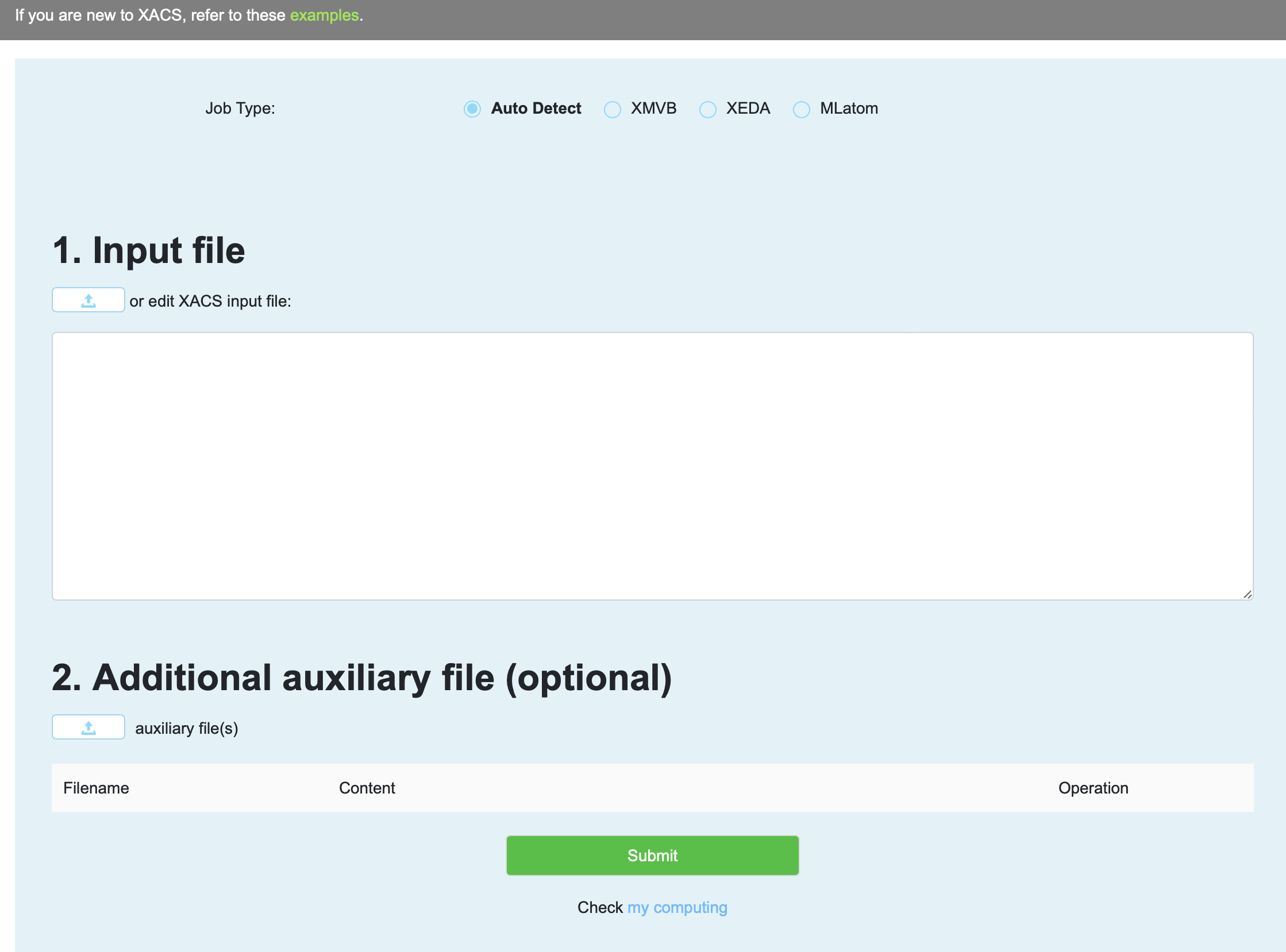 XACS cloud computing is the main feature of XACS. What makes it a great feature is that it was absolutely free in 2022 (and will be in the future under some conditions)! During the year we managed to converge disparate pages of cloud computing of each package into a single cloud computing page that provides the user with a unified input for any type of calculations. The current page is extremely simple but provides all the required functionality for writing program inputs and uploading required files: